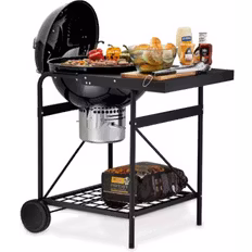 Charcoal BBQ, BBQ Trolley, Height Adjustable Grid, Side Table, Thermometer, Wheels, Lid, Warming Rack, Air Inlet, Removable Ash Catcher, Enclosed Lid