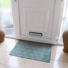 Entrance mats are floor coverings placed at entry points to trap dirt and moisture. They help maintain cleanliness indoors.