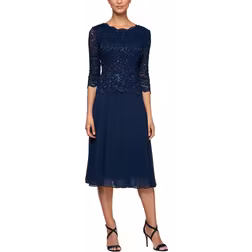 Alex Evenings Tea Length Sequin Mock Dress Petite Regular - Navy