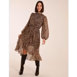Leopard Print High Neck Wrap Frill Hem Midi Dress - 10 / Tan
