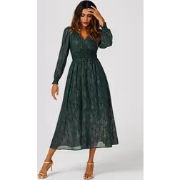 FS Collection Gold Stripe Foil V-Neckline Long Sleeve Maxi Dress In Green