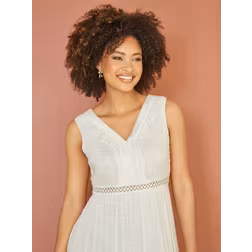 Yumi White Lace And Dobby Cotton Midi Sundress Dress - Size S UK