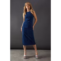 Warehouse Women's Denim All Over Hot Fix Sleeveless Fitted Midi Dress in Dark Wash | Size: 12