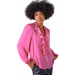 Roman Satin Ruffle Neck Blouse - Cerise, Pink