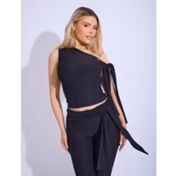 Knot Detail Asymmetric One Shoulder Luxe Slinky Top Black - 8