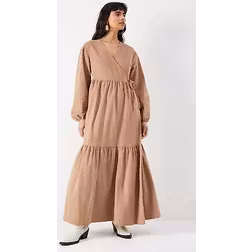 Warehouse Women's Baby Cord Wrap Midi Smock Dress in Taupe | Size: 10