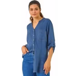Roman V-Neck Longline Button Detail Blouse - Denim Blue