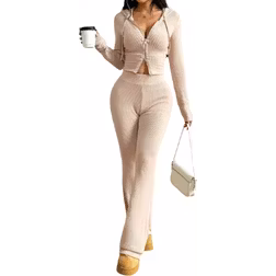 Hanevo Apricot Fleece Knitted Texture Stand Collar Zipper Front Cropped Hoodie And Retro Flare Leg Long Pants, Simple Casual Sports Minimalist All-Match Esse