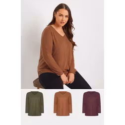 Yours 3 Pack Plus Size Brown & Khaki Green Long Sleeve Vneck Tshirts Size 16