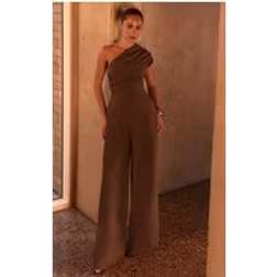PrettyLittleThing PLT Label Asymmetric Ruched Wide Leg Jumpsuit - Dark Taupe