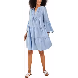 Light Blue Flute Sleeve Tassel Cotton Tiered Mini Dress, Size: XS, Women's - Accessorize