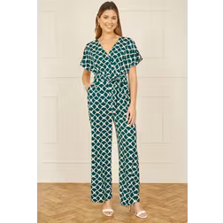 Yumi Green Geometric Print Wrap Jumpsuit - Size 8 UK - Yumi