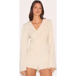 PrettyLittleThing Cream Pinstripe Peachskin Wrap Front Long Sleeve Playsuit - White