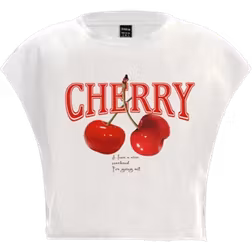Slaydiva Casual Simple Red Cherry Pattern Letter Print Loose Cropped Round Neck Short Sleeve T-Shirt For Women,Slightly Sheer Suitable For Summer