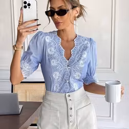 Shein Women's Stylish Elegant Embroidered Scallop Edge V-Neck Short Puff Sleeve Blouse - Spring/Summer