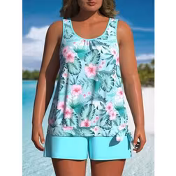 Shein Plus Size Women's Tankini Set Tank Top Shorts - Sky Blue Floral Print