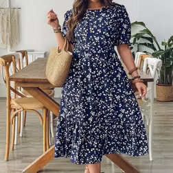 Shein Plus Size Summer Casual Holiday All-Over Print Round Neck Short Sleeve Ruffle Hem Dress - Women