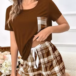 SHEIN Women's Plaid Pocket Short Sleeve T-Shirt And Shorts Loungewear Set