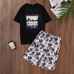 SHEIN 2pcs/Set Men's Casual Vacation Style Letter Print Short Sleeve Pajama Top And Shorts Set