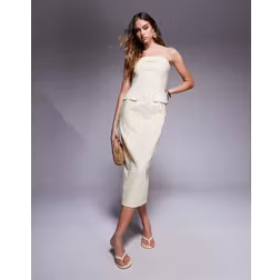 Kaiia exclusive linen look tailored fold over bandeau pocket detail midaxi dress in buttermilk-Yellow