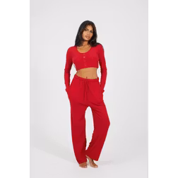 Brave Soul Women's Cropped Long Sleeve & Wide Leg Lounge Set in Red | Size: XS