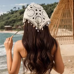 SHEIN 1pc Women Beige Floral & Seashell Tassels Knit Hollow Lace Headband, Suitable For Daily Wear, Sports, Beach, Vacation Matching Bandanas Head Bandana H