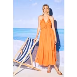 HCD Chiffon Ruffle Strappy Floaty Maxi Dress - Orange - 12