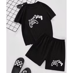 SHEIN Men's Casual Black Gamer Print Colorblock Round Neck Regular Sleeve Pajama Set With Pocket