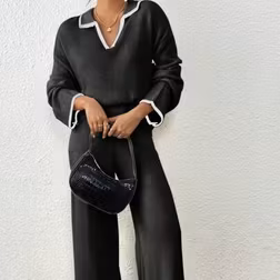 SHEIN Joy Knit Women Casual Dropped Shoulder Loose V-Neck Contrast Binding Sweater And Loose Wide Leg Knit Pants Set