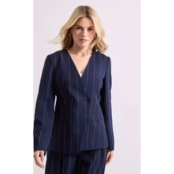 V Neck Longline Pinstripe Blazer - Navy - 18