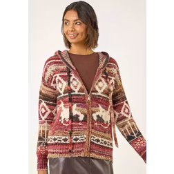 Jacquard Zip Hooded Cardigan - Burgundy - 10