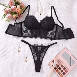 Shein Elegant Black Lace Three-Piece Lingerie Set With Sheer Floral