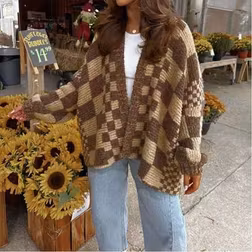SHEIN Vivid Style Women's Checkered Knitted Cardigan, Lantern Sleeve Relaxed-Fit Oversized Jacket, Retro Autumn/Winter Sweater