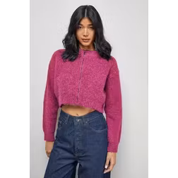 Warehouse Women's Zip Up Rib Crew Cardigan in Pink | Size: Small