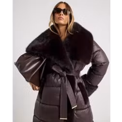 River Island Faux Fur Collar Belted Padded Coat - Brown