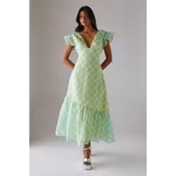 Check Organza Plunge Neck Frill Shoulder Midi Dress - Multi - 10