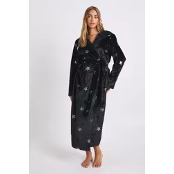 boohoo Star Print Fleece Hooded Long Dressing Gown - Black