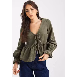 New Look Cord Tie Front Peplum Shirt - Khaki Green