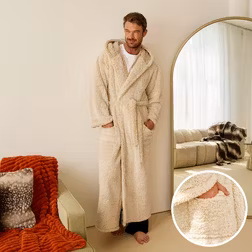 OHS Beige Dressing Gown Teddy Marl, Super Soft Warm Hooded Full Length Unisex Bath Robe with Pockets Oversized Dressing Gown for Adults Loungewear & Sleepwear, One Size