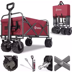 Sekey Folding Festival Trolley with Wide All-Terrain Wheels, 440LB Large Load Capacity, Heavy-Duty Camping Wagon with Brake, Sturdy Beach Garden Cart, Adjustable Handles & Drink Holders, Red