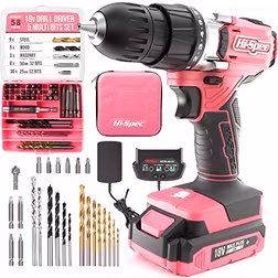 Hi-Spec 58pc 18V Pink Womens Electric Cordless Power Ladies Drill Driver Set with Rechargeable Battery, Power Screwdriver Bits, Wood and Metal Drill Bits. All in a Compact Case