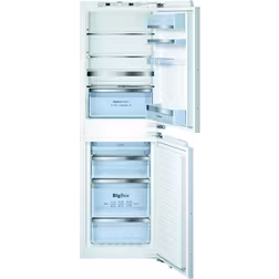 This is an integrated fridge freezer where the fridge is on top of the freezer. The volume of the fridge is 153 litres. It has several features, including glass shelves.