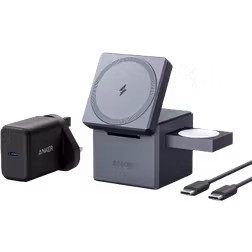 Anker 3-in-1 Cube Compatible with MagSafe - 15W Fast Charging, Foldable Wireless Charge Station for Apple Watch, iPhone 17/16/15/14/13, and AirPods Pro (Charger and Interchangeable Plugs Included)