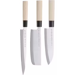 This Japanese knife set contains three different knives, for example a cooks knife. The blades are made from so-called carbon steel and can be sharpened to have a very sharp edge,