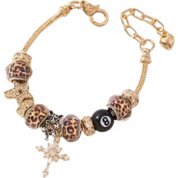 SHEIN 1pc Teenager DIY Beaded Bracelet With Copper Cross, Leopard Print Beads, And Black Tassels, Fashion Jewelry, Gift For Birthday