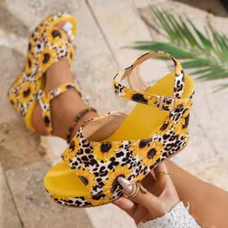 SHEIN Women's Peep-Toe Platform Wedge Heeled Sandals, Yellow Floral Print Strap, Fashion Summer Beach Holiday Waterproof Thick Sole High Heel Shoes With Ran
