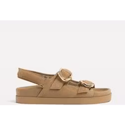 Stradivarius Leather Flat Sandals With Buckles - Beige