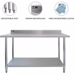 4FT Kitchen Work Bench Catering Table Stainless Steel Commercial Restaurant Food Prep Surface Storage Shelf 250kg Weight Capacity Adjustable Height 10cm Backsplash Upstand 2 x FREE Microfibre Cloths