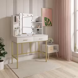 Dressing Table with led Lights. Mirrored Vanity Table with Shelves and 2 Drawers. Modern Makeup Table in mdf and Metal. Bedroom Furniture.