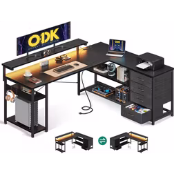ODK Corner Desk with Drawers, L Shaped Gaming Desk with LED Lights & Power Outlets, Reversible Computer Desks for Home Office Workstation, Office